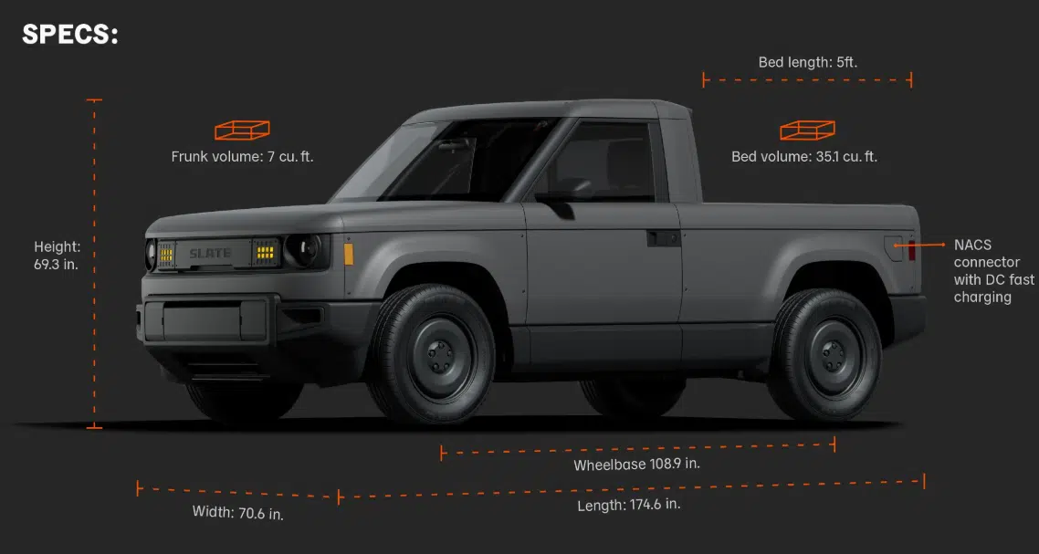 Slate said its EV pickup, a bare-bones truck with a footprint smaller than a Ford (F) Maverick, will cost somewhere in the mid-$20K range, and it will come in any color you want as long as its slate gray, that is. The option-challenged vehicle offers a choice of two battery sizes for the rear-wheel-drive truck: a 52.7-kWh battery pack targeting 150 miles of range and an 84.3-kWh pack with 240 miles of range.