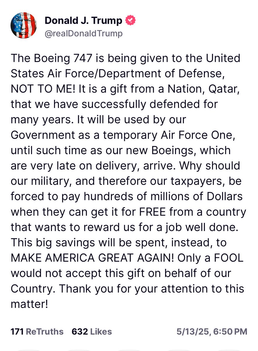 (2,695 posts)By far the smartest thing to do would be to take it (since it's free) but deploy it for some other useful purpose that won't cost a fortune to retrofit it for. Hell, sell it to freaking United or some shit. What's Qatar going to do about it? If Trump's accounting is true that they're gifting it to the USA as 'payback' for 'defending their country', We The People should be to use it for whatever makes financial sense.