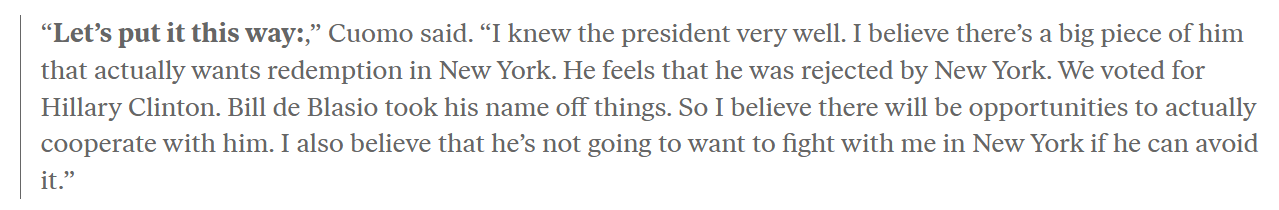 This statement is all the more remarkable because Cuomos big selling point in the Democratic primary was the spurious claim that he was a tough guy who could stand up to Trump like no other. Mamdani naturally seized on the Politico report to discredit Cuomo.