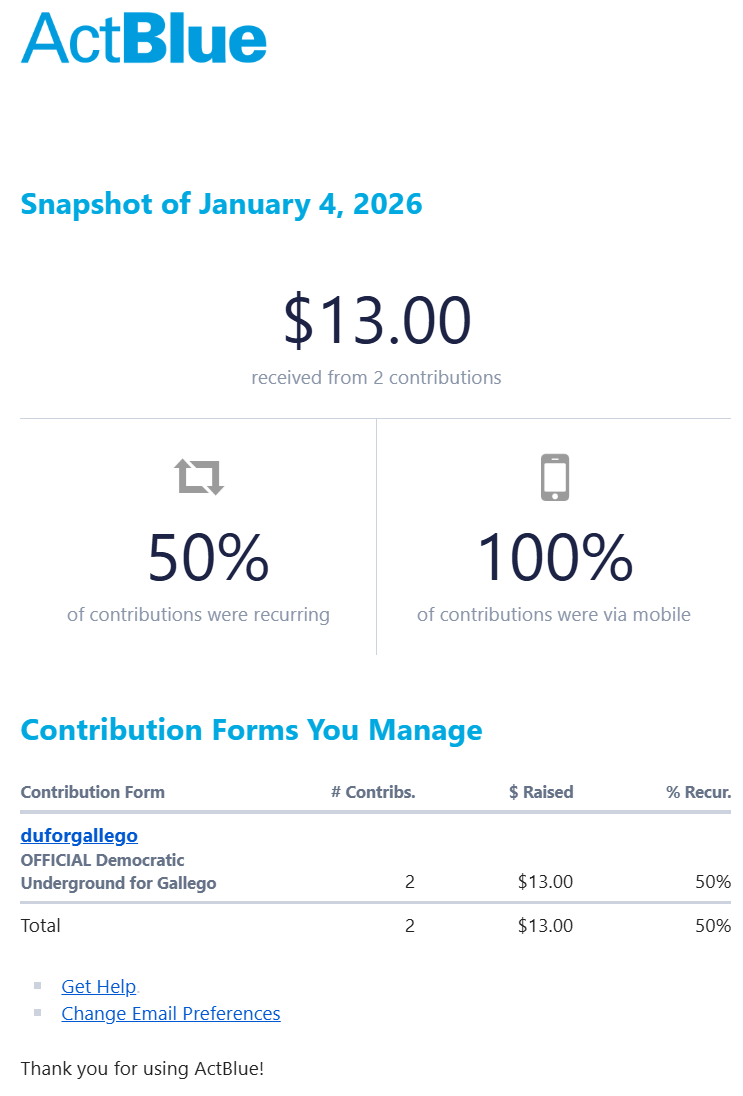 You raised $13.00 on January 4, 2026 @ ACtBlue