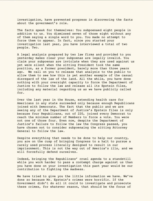 All the while, you have done nothing with your oversight capacity to force the Department of Justice to follow the law and release all its Epstein files, including any material regarding us as we have publicly called for