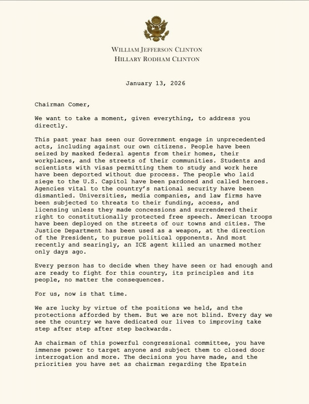 The letter from Bill and Hillary Clinton to James Comer explaining their refusal to testify in his Epstein investigation is really remarkable, not like any letter of this genre I've seen. It's signed by them, not a lawyer, and the arguments are not legal ones. Reprinted from their X account: