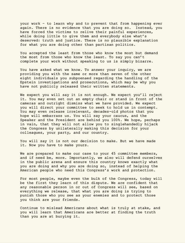 To answer your inquiry, we are providing you with the same or more than seven of the other eight individuals you subpoenaed regarding the handling of the Epstein investigations and prosecutions, which may be why you have not publicly released their written statements