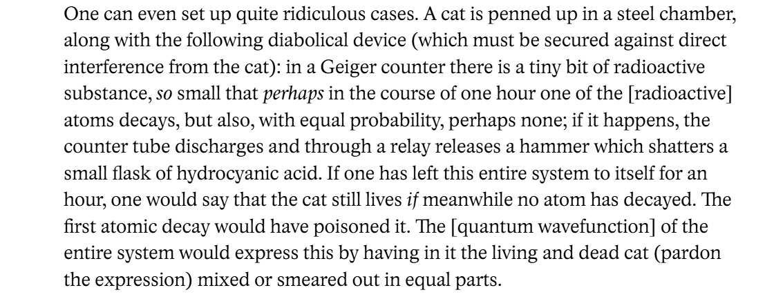 In 1935, the Austrian physicist Erwin Schrödinger published a rather critical three-part review of what he called the present situation in the relatively new theory of quantum mechanics. For the most part, Schrödingers review, written in German, is dry and technical, and not the kind of thing that would detain anyone outside the narrow academic world of quantum physics. But in one short paragraph, written with his tongue firmly in his cheek, he gave flight to a fancy that, 90 years later, continues to resonate in popular culture. The paragraph concerned Schrödingers eponymous cat. How did an obscure argument about a mathematically complex and rather baffling theory of physics become embedded in public consciousness as an extraordinary exploration of the human psyche? This essay tells the story. Heres what Schrödinger wrote (in the English translation by John D Trimmer):