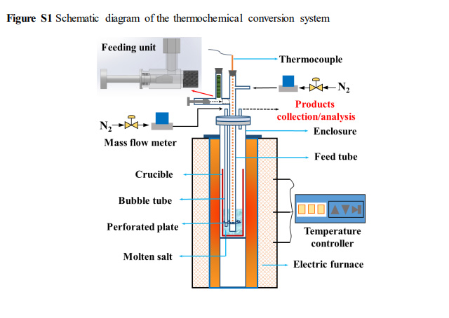 Conventional thermochemical processes for microalgae, such as pyrolysis and gasification, are often constrained by persistent tar formation, ash clogging, and insufficient hydrogen yield/purity, (4−6) which adversely affect process efficiency and economic viability. In response, molten salt technology has emerged as a promising alternative, with molten hydroxides proving particularly effective. (7) These salts serve simultaneously as an efficient heat transfer fluid, an effective cracking catalyst, and a selective CO2 absorbent. (8,9) Previous work by the authors has demonstrated the superior effectiveness of molten hydroxides for microalgae processing, achieving a hydrogen yield of 67 mmol/g-microalgae with a purity of 80% while reducing tar formation by over 99%. (10,11) Approximately 58% of this hydrogen originated from the hydroxide itself, with the hydrogen utilization efficiency from the algae reaching 84.86%. This integrated performance outperforms that of the majority advanced catalytic and chemical looping systems in terms of clean and efficient hydrogen production...